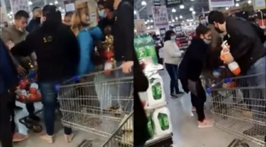 Incluso, cuando ambos protagonistas comenzaron a empujarse y tironearse, una persona aprovecha la situación para llevarse el huevo de pascuas de un carro de compras de uno de los clientes.