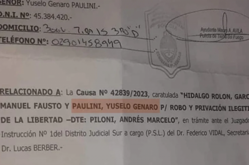La familia de Yuselo Genaro Paulini, de 18 años, publicó la notificación del Juzgado interviniente, donde señala que el mencionado no está vinculado al caso caratulado “Robo y privación de la libertad”, del cual resultó víctima el odontólogo Ariel Marcelo Piloni, quien denunció que el hecho sucedió el día 7 de febrero, en su domicilio.