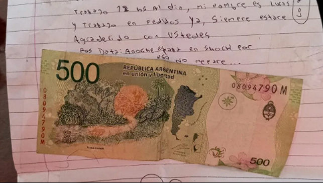 Una chica compartió en su perfil que una persona le había dejado en el buzón de su casa una carta escrita de su puño y letra con $500 de regalo. Según explicó, estaba firmada a nombre de un tal “Lucas”, un joven trabajador de delivery al que la noche anterior había ayudado junto a su familia cuando unos ladrones intentaban robarle la moto con la que trabajaba.