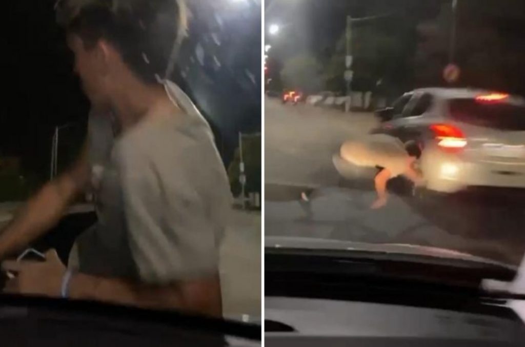 Los jóvenes se reían y divertían con la situación, cuando de repente el auto frenó y el joven cayó en el pavimento. En ese momento se ve cómo otro vehículo que transitaba por la misma calle tuvo que esquivar al joven para no acabar en una tragedia.