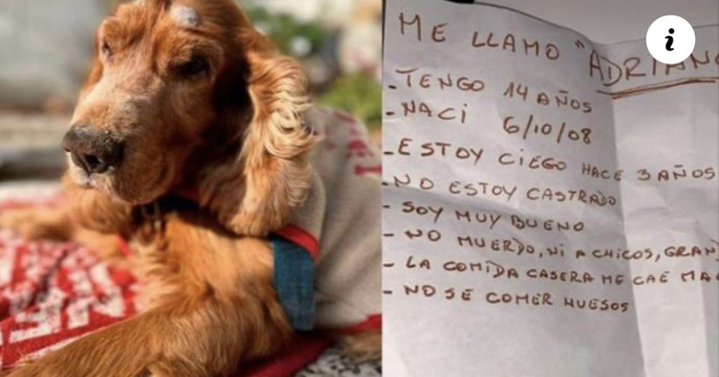“Me llamo Adriano. Tengo 14 años. Nací el 6 de octubre de 2008. Estoy ciego hace tres años. No estoy castrado. Soy muy bueno. No muerdo ni a chicos, a grandes ni a otras mascotas. La comida casera me cae mal. No se comer huesos”, decía el mensaje.