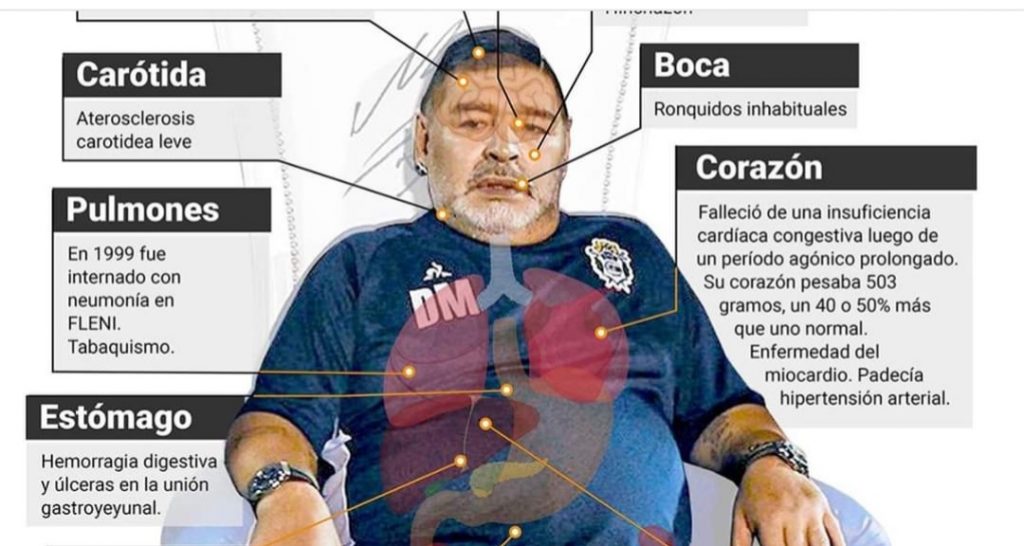 Por supuesto, a nadie escapa que la clave de la mala salud de Diego pasaba por su corazón, algo golpeado, entre otras cosas, por una hipertensión arterial, una aterosclerosis leve en la carótida (según un Eco Doppler de vasos de cuello que le practicaron en la Clínica IPENSA de La Plata el 9-9-2020), el tabaquismo, la obesidad, el sedentarismo y su enfermedad renal crónica. Esto suponía un “riesgo cardiovascular intermedio/alto”. El trabajo de los peritos sostiene que “falleció de una insuficiencia cardíaca congestiva luego de un período agónico prolongado”, como se detalló. Su corazón pesaba 503 gramos, un 40 o 50% más que uno normal. Esto se traduce en una cardiopatía hipertrófica ventricular izquierda, agrandamiento de aurícula izquierda y disfunción diastólica asociadas a los sedimentos acumulados por años de consumo de cocaína y alcohol. “Resulta un corazón insuficiente para solventar las necesidades del organismo”, resumen.