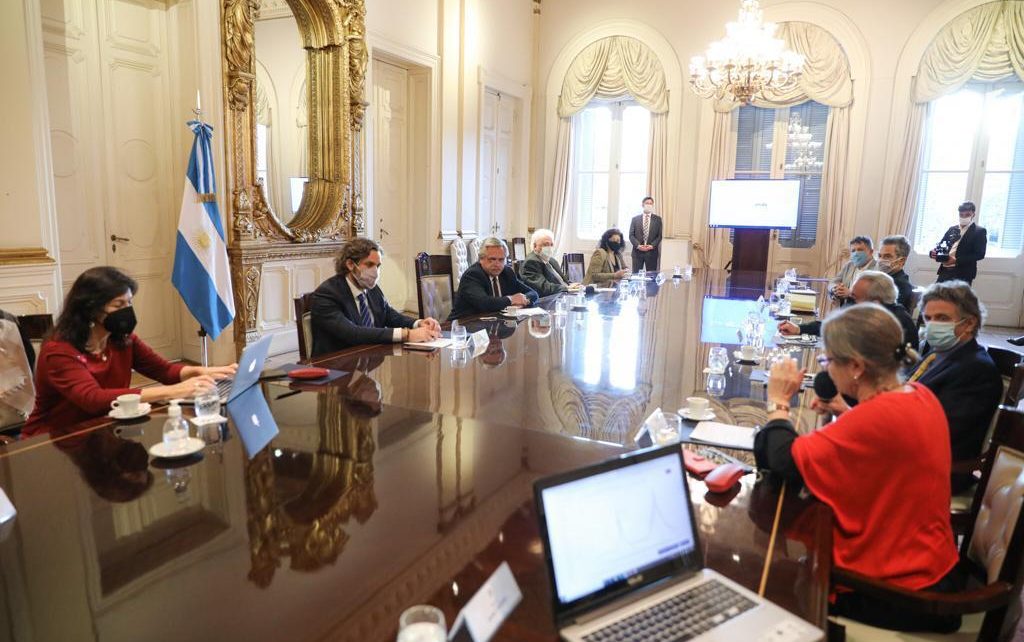 El presidente Alberto Fernández encabeza esta tarde una reunión en el Salón Eva Perón de la Casa Rosada con el grupo de expertos médicos e infectólogos que asesoran al Gobierno nacional sobre la pandemia de coronavirus.