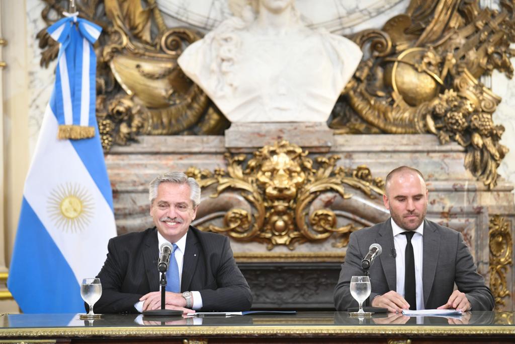El presidente de la Nación, Alberto Fernández, junto al ministro de Economía, Martín Guzmán, anunciaron hoy un refuerzo de ingresos para los trabajadores y trabajadoras informales y de casas particulares, monotributistas, jubilados y pensionados, en el Salón Blanco de la Casa Rosada.