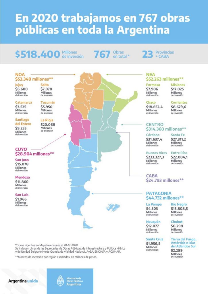 El Ministerio de Obras Públicas avanza con la ejecución de 767 obras en las 23 provincias del país y la Ciudad de Buenos Aires, por una inversión de $518.400 millones, con el objetivo de impulsar la reactivación de la economía en el país.