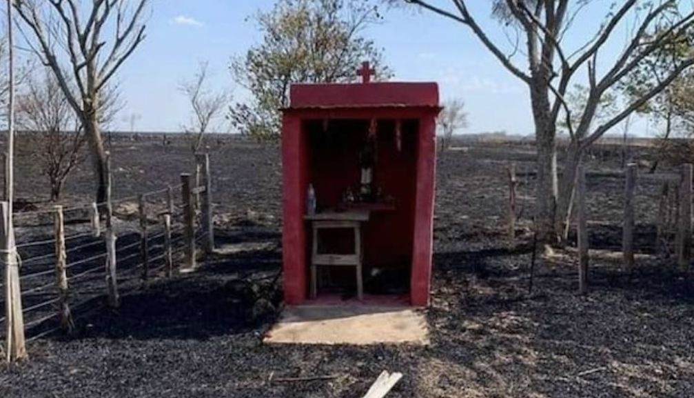 Tanto la imagen del Gauchito Gil como las habituales banderas rojas que se ponen en su honor se salvaron del fuegoinexplicablemente, ya que todo a su alrededor estaba incinerado.