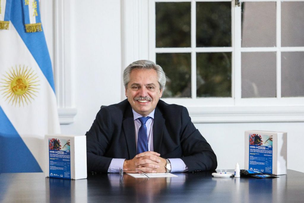 El presidente Alberto Fernández encabezó esta tarde en la residencia de Olivos la presentación de un test de diagnóstico rápido y económico desarrollado por científicos argentinos para detectar el SARS-CoV-2. El “NEOKIT-COVID-19” permite obtener resultados en menos de 2 horas con similar sensibilidad que las técnicas actuales de PCR y ya fue aprobado por la ANMAT.