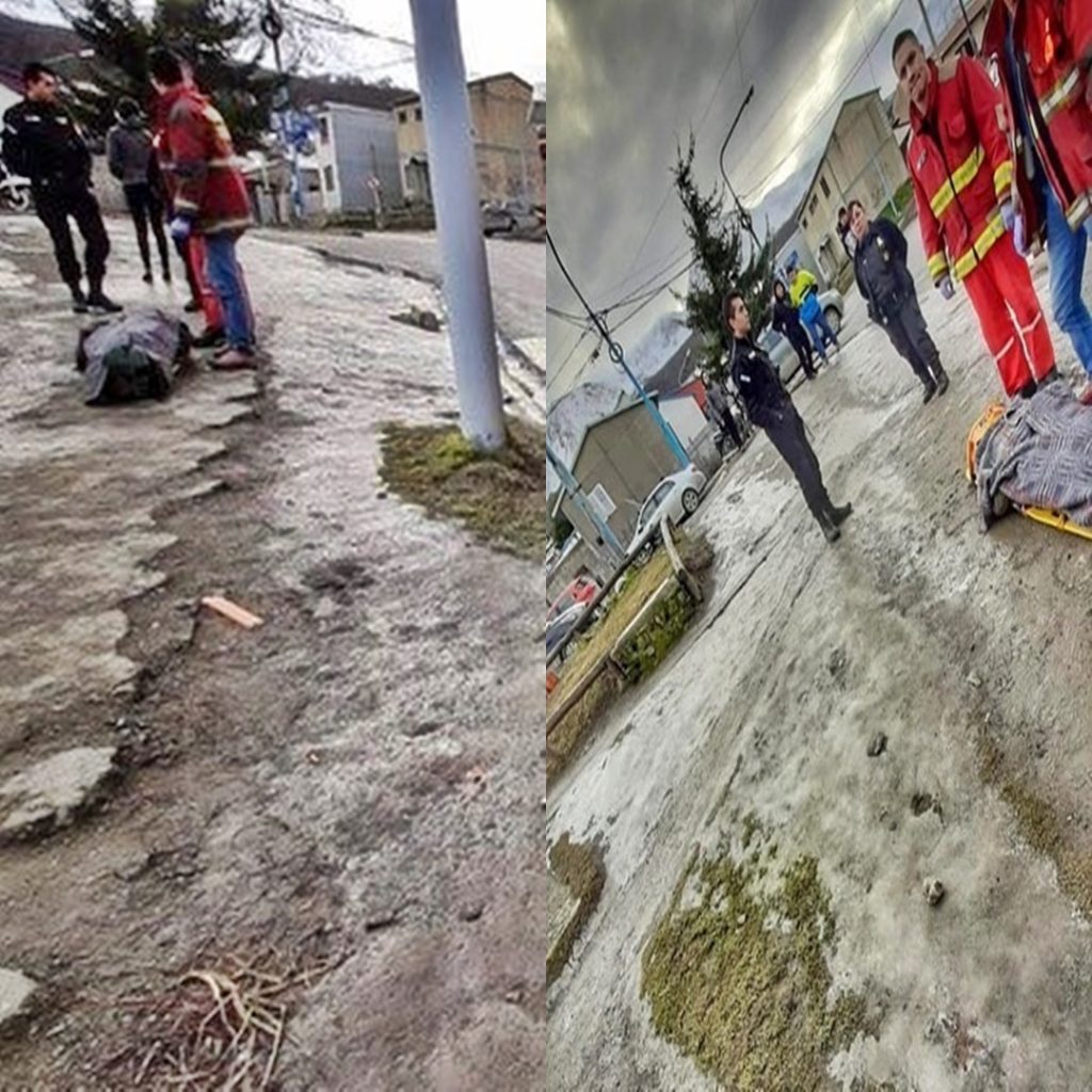 Según se informo desde Bomberos Ushuaia, fueron alertados sobre una mujer caída en la vía publica, en la intersección de Darwin y Beavouir -en inmediación de los playones municipales-, al llegar al lugar se encontraron con la mujer tendida en el piso, quien luego de patinarse por la cantidad de hielo que había en la vereda golpeo su cabeza de manera violenta.