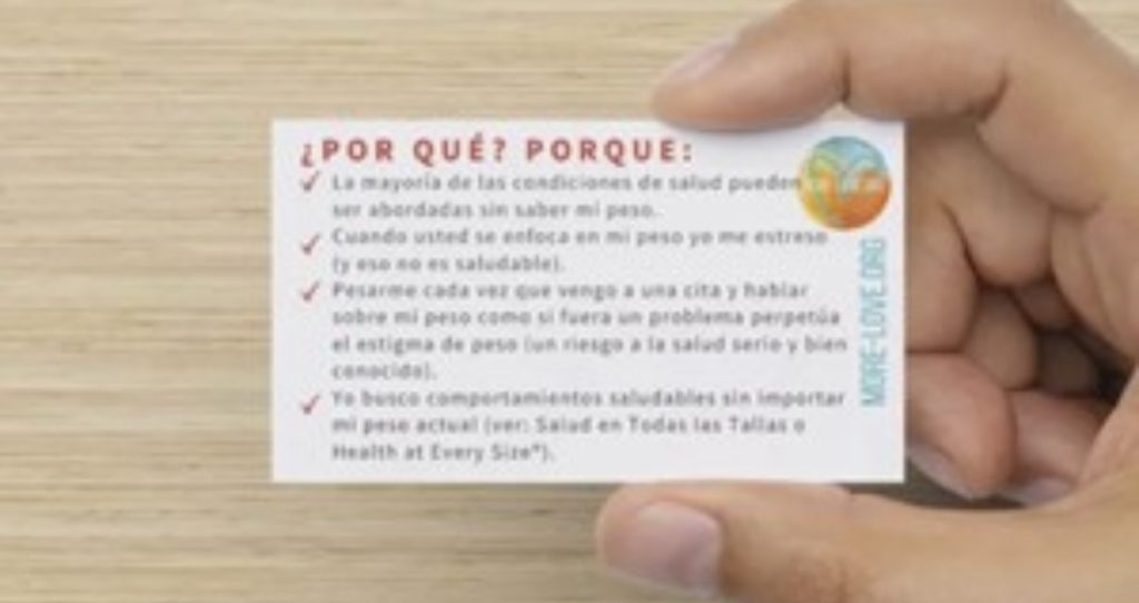 «Si realmente tiene que pesarme, por favor dígame por qué para que yo pueda darle mi consentimiento informado», señala la tarjeta que desarrolló una ONG para que los pacientes le entreguen al médico.