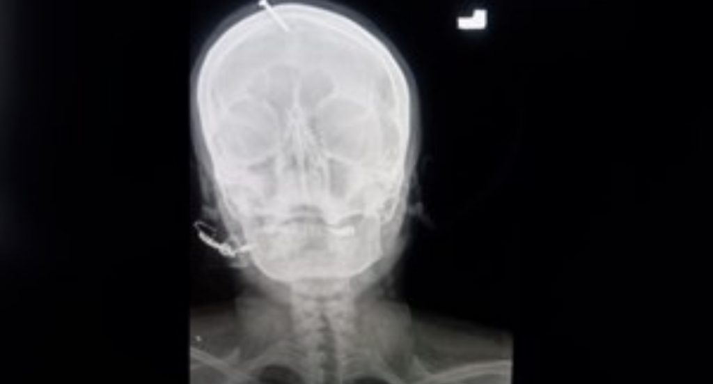 Una radiografía mostró que el clavo había sido clavado cinco centímetros en el cráneo, sin llegar al cerebro.