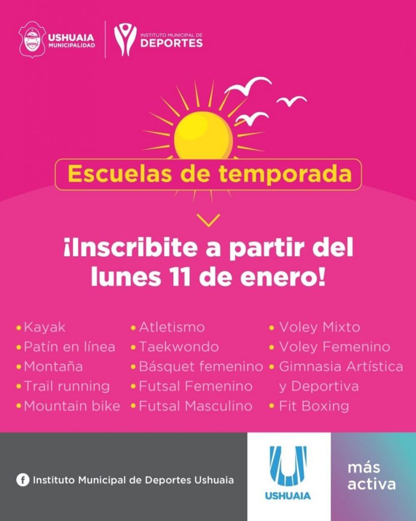 Las inscripciones se llevarán a cabo a través de la página de Facebook del IMD, https://www.facebook.com/Instituto-Municipal-de-Deportes-Ushuaia-100334044949315/, el lunes 11 de enero desde las 14 Hs. Podrán anotarse en Kayak, Patín en línea, Trail running, Mountain Bike, Atletismo, Taekwondo, Basquet Femenino, Futsal Femenino,Futsal Masculino, Beach Vóley mixto, Vóley mixto, Vóley Femenino, Gimnasia artística y deportiva, y Fit Boxing.