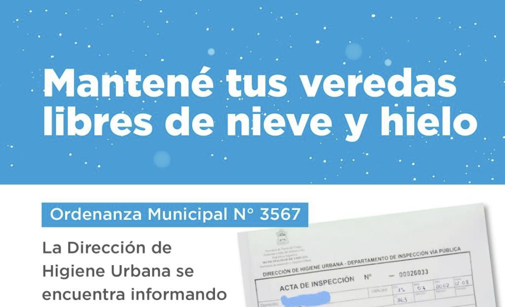 La Municipalidad de Ushuaia, a través de la Secretaría de Medio Ambiente y Desarrollo Sustentable, recuerda a los vecinos y vecinas de la ciudad, comercios y empresas frentistas que deben mantener limpias las veredas en el marco del cumplimiento de la Ordenanza Municipal N°3567, para evitar la acumulación de nieve o hielo.