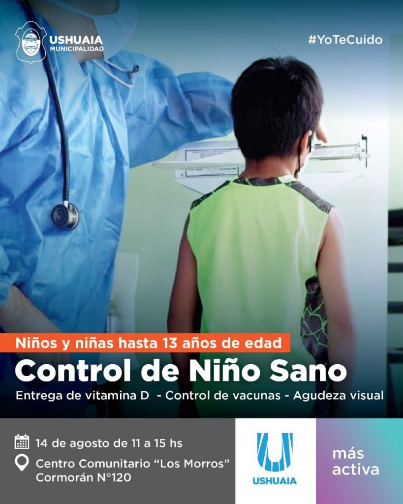 La Municipalidad de Ushuaia, a través de la Subsecretaría de Políticas Sanitarias, llevará a cabo una jornada de “control de niño sano”, en el centro comunitario del barrio Los Morros este sábado 14 de agosto, de 11 a 15 horas, para niños y niñas de hasta 13 años.