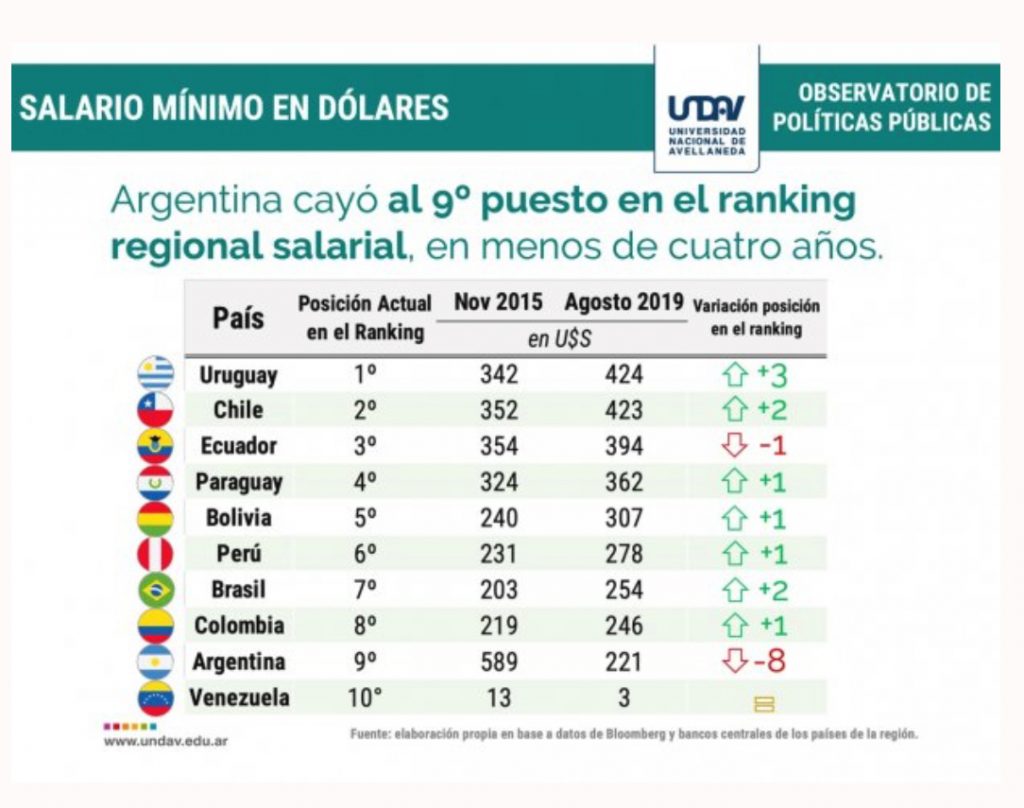El Salario Mínimo Vital y Móvil cayó en la Argentina 61,9% y se ubicó anteúltima en un ranking de países de la región, solo por encima de Venezuela, desde fines de 2015 cuando estaba en los u$s580 frente a los u$s221 actuales, destacó un informe de la Universidad Nacional de Avellaneda.Así, Argentina perdió 8 posiciones en el ranking regional de salariosmínimos en dólares. En los últimos tres años, pasó de la primera a la novena posición.