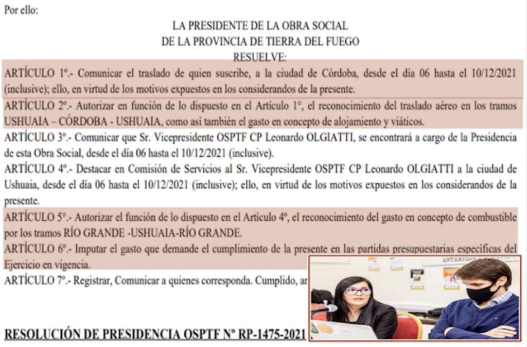 Tampoco el vicepresidente Leonardo Olgiatti se quedo atrás ya que para cumplir funciones ante la ausencia de Hruby debe trasladarse de Rio Grande a Ushuaia y aprovechando la generosidad de la Obra Social esta tendrá que hacer cargo de los gastos de combustible que implique el traslado de Olgiatti a la capital fueguina.