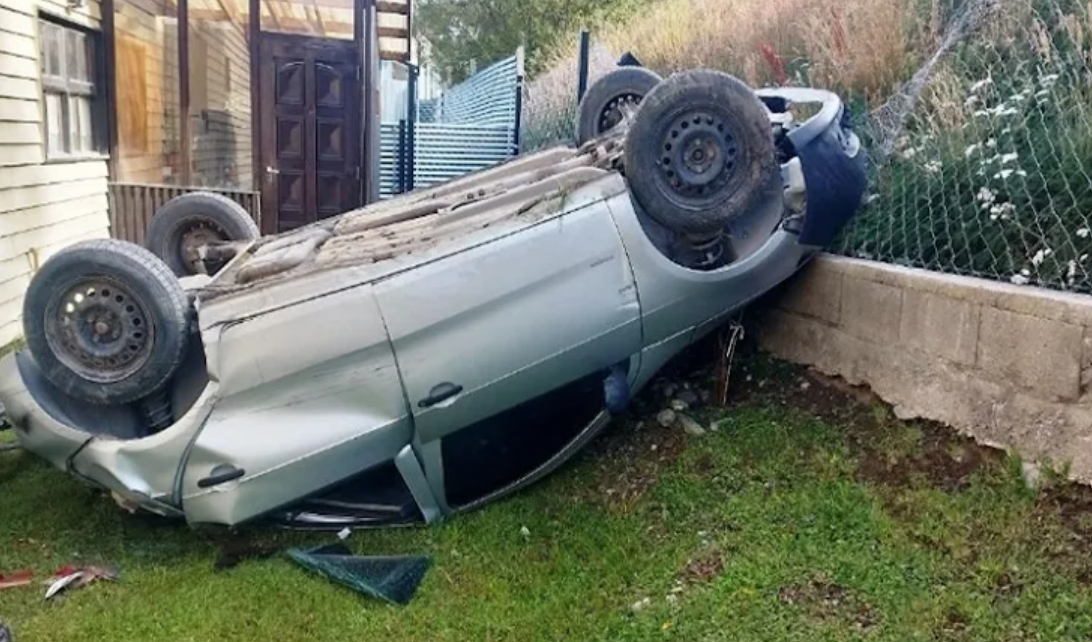 Un vehículo conducido por Jeremias Morales desbarrancó y quedó volcado en un patio en la ciudad de Ushuaia. No hubo heridos.