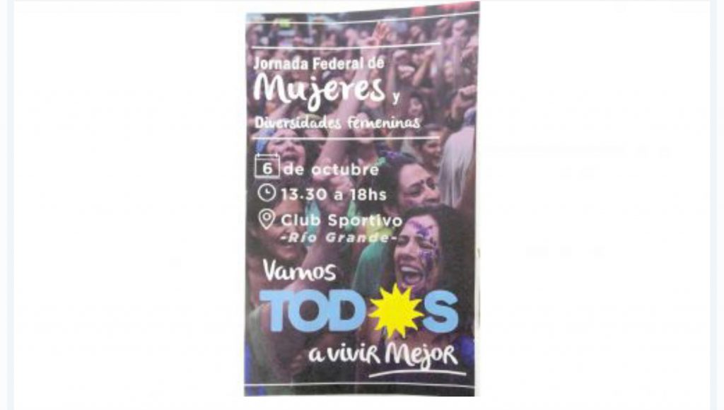Como prueba de lo denunciado aportan una impresión de pantalla de la red social Facebook del Frente Mujeres Forja TDF del partido Concertación Forja, en la que se ve un afiche de la Jornada Federal de Mujeres y diversidades femeninas que se desarrollarán en el Club Sportivo de Río Grande el próximo domingo 6 de octubre.