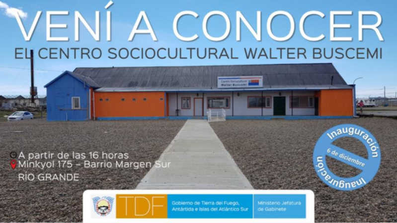 Jueves 6 de diciembre a las 16:00 se inaugura el nuevo centro sociocultural Walter Buscemi en Minkyol 175 B° Margen sur..