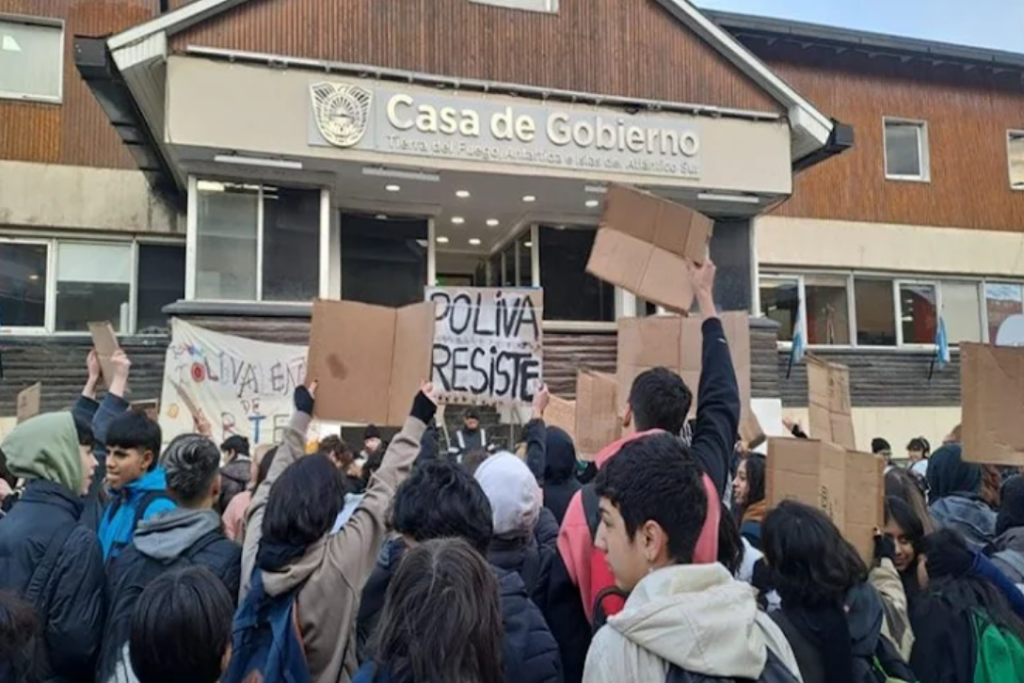Movilización de alumnos de colegios de Ushuaia a Casa de Gobierno, por reparaciones en establecimientos educativos, aunque desde la EPET aclararon ademas que “El principal reclamo es que estudiamos y no nos validan el título”, contó una estudiante.