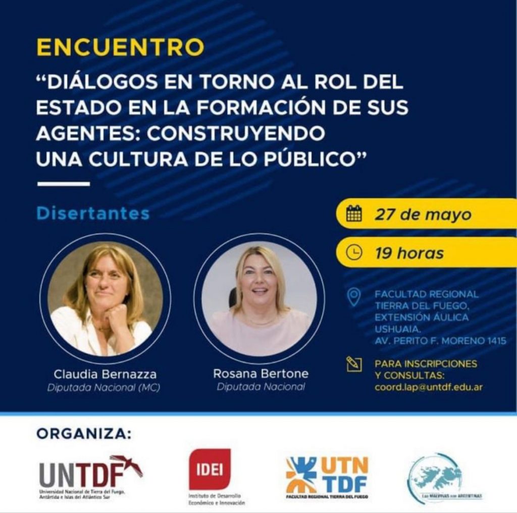 El el marco del encuentro “Dialogos en torno al rol del Estado en la formación de sus agentes: construyendo una cultura de lo público”, la Diputada Nacional por Tierra del Fuego, Rosana Bertone junto a Claudia Bernazza (diputada nacional mandato cumplido) realizarán una charla abierta a la comunidad en la Facultad Regional Tierra del Fuego Extensión Aulica Ushuaia, cita en Av. Perito Moreno 1415 este 27 de mayo a las 19 horas.