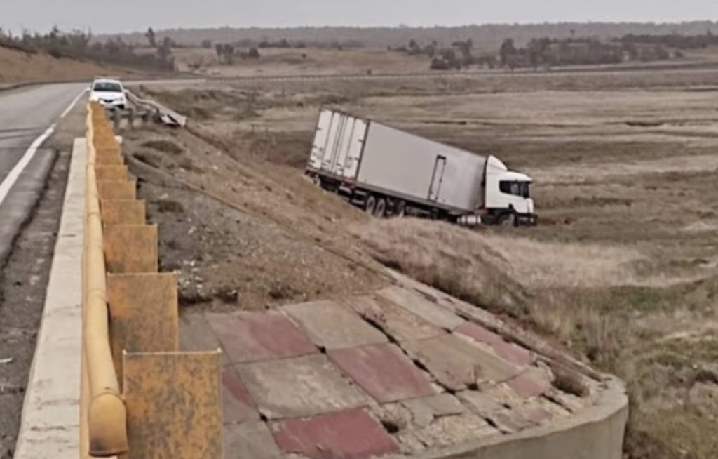 Un camión de transporte Scania Furgon, de la empresa Graca, despistó sobre un sector de la ruta nacional 3, a la altura del río Ewan Norte (ubicado a 49 km. al norte de la localidad de Tolhuin).