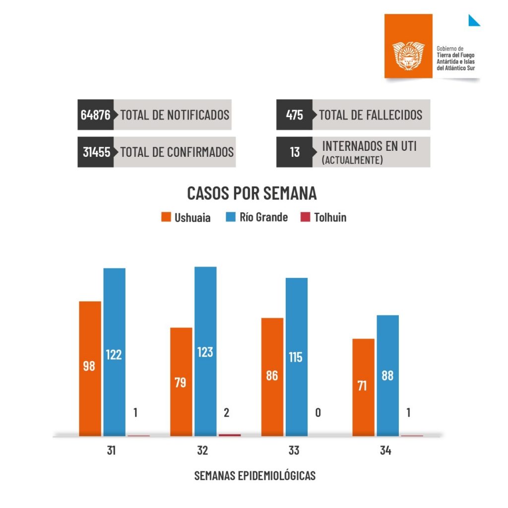 En la última semana se detectaron 71 casos nuevos en Ushuaia, 88 en Río Grande y 1 en Tolhuin. Actualmente hay 13 pacientes internados en UTI en toda la Provincia. El número de altas desde el inicio de la pandemia asciende a 30.856. Hay en el día de la fecha 124 casos activos en Tierra del Fuego.