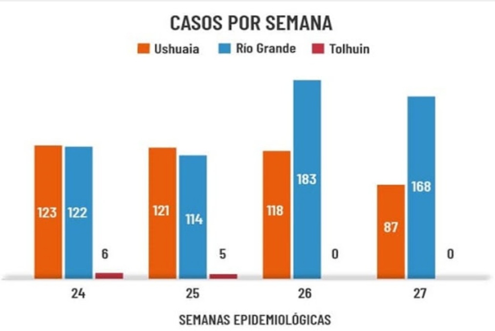 En la última semana se detectaron 87 casos nuevos en Ushuaia, 168 en Río Grande y 0 en Tolhuin. Actualmente hay 11 pacientes internados en UTI en toda la Provincia.