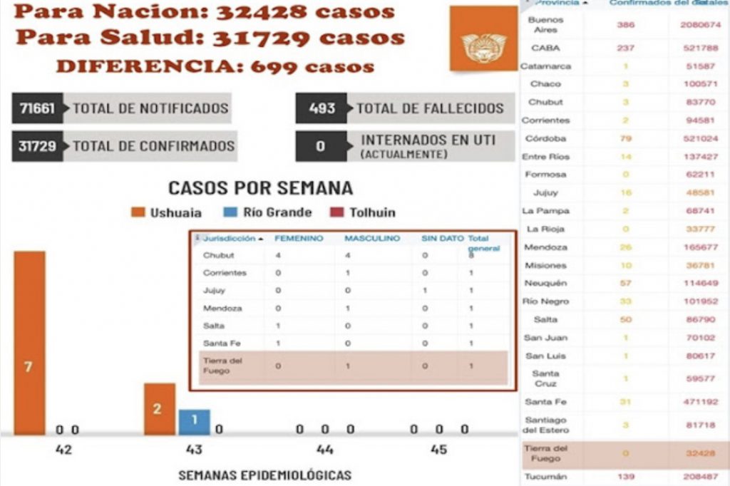 Mientras en la pagina oficial de Nación se informan que hasta la fecha se registraron 32428 casos, en el ultimo reporte semanal del Ministerio de Salud de Tierra del Fuego, se informan 31729 casos confirmados, una diferencia de 699 casos entre los dos reportes oficiales.