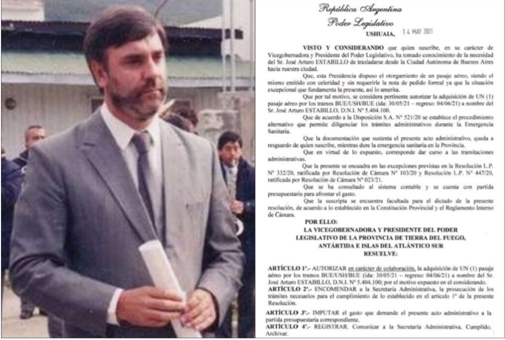 Hace pocos días salió a la luz pública el pago de un pasaje aéreo por parte de la Legislatura Provincial, cuya presidencia es ejercida por la mopofista Mónica Urquiza, beneficiando al ex gobernador Jose Arturo Estabillo. Si bien es entendible que en un sistema democrático existe la división de poderes, Ejecutivo,Legislativo y Judicial este hecho no deja de ser repugnante para una castigada y sufrida ciudadanía, ya que los dineros aportados con esfuerzo a la hora de pagar impuestos, fueron usados para pagarle un pasaje nada menos que a un “ personaje nefasto” de la política fueguina, por su desempeño como gobernador del Movimiento Popular Fueguino entre 1992 al 2000. Y además porque este sujeto cuenta con una holgada solvencia medida en un patrimonio millonario como para que encima la gente tenga que “bancarle” un boleto de avión para que viaje a su ciudad natal – Ushuaia – desde Buenos Aires, en donde está radicado desde hace muchos años.