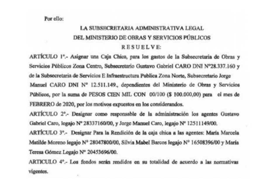 Y es que resulta llamativo que se publique en el Boletín Oficial N° 4641 del 16 de julio (página 9) una asignación presupuestaria efectuada, aparentemente, durante el mes de febrero del 2020. En este casos dicha inyección dineraria se trata de una «caja chica» para la Subsecretaría de Obras y Servicios Públicos Zona Centro, a cargo de Gustavo Gabriel Caro y también para la Subsecretaría de Obras y Servicios Públicos Zona Norte, a cargo del Subsecretario Jorge Manuel Caro por la suma de 100 mil pesos.