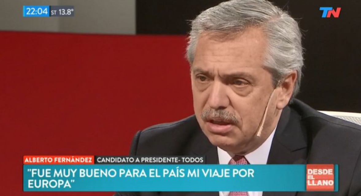El candidato del Frente de Todos, en una entrevista con TN, dijo que, si llega al gobierno, no hará «política en los tribunales» y se quejó de los debates de los postulantes presidenciales, pero garantizó que asistirá.