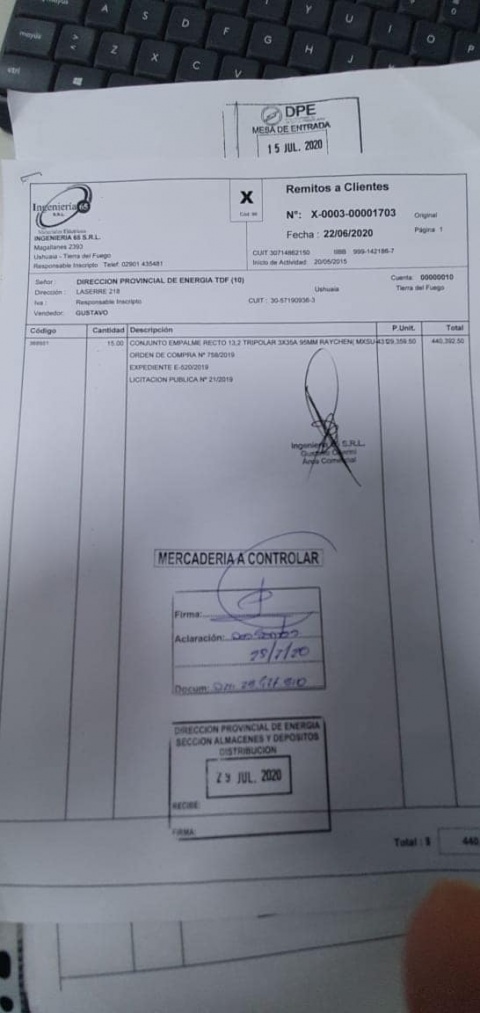A pesar del informe del Tribunal de Cuentas de la Provincia donde se le sugiere a la Dirección Provincial de Energía que no se reciban los insumos de una licitación que data más de un año, los materiales adquiridos fueron recibidos el día 26 de junio pasados por personal de la institución, según lo indican remitos firmados. La funcionaria Gabriela Castillo sostenía que nunca habían sido entregados.