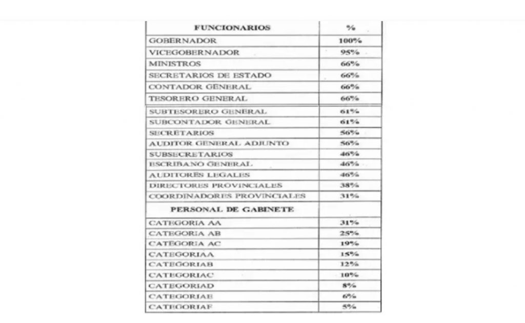 En función de ello, por ejemplo, el porcentaje de enganche entre el sueldo de un ministro y el del Gobernador pasó del 80% al 66%, el de un Coordinador Provincial del 42 al 31% y el de un agente categoría A de Gabinete del 22 al 15%.
