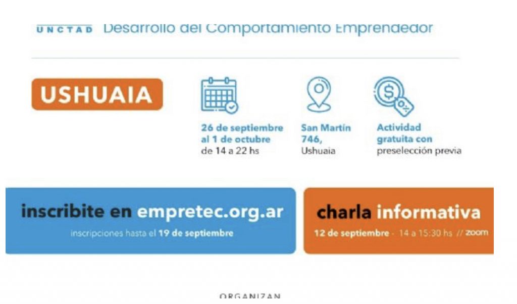 Las y los participantes interesados en formar parte del mismo podrán participar de la charla informativa virtual que se realizará el lunes 12 de septiembre a las 14 hs, con inscripción en el siguiente link: https://bit.ly/charlaempretec_ushuaia
