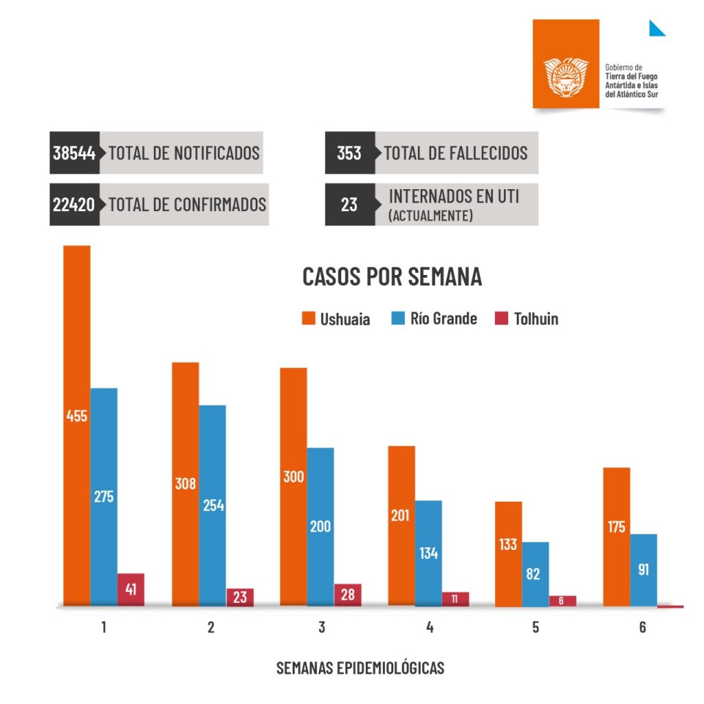 En la última semana se detectaron 175 casos nuevos en Ushuaia, 91 en Río Grande y ninguno en Tolhuin. Al día de la fecha hay 23 internados en UTI en toda la Provincia.