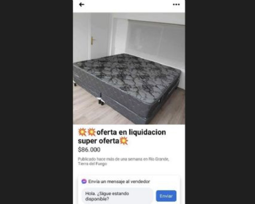 Horas atrás, en grupos públicos de Río Grande se alertó sobre una nueva estafa vigente en Facebook, la cual fue desenmascarada por una usuaria que dio cuenta de la publicación en venta de un sommier, es decir, un colchón de dos plazas con su respectiva plataforma.