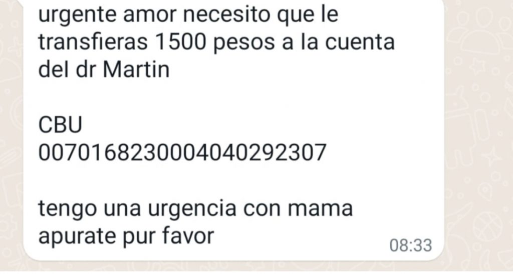 «Urgente amor necesito que le transfieras 1500 pesos a la cuenta del Dr. Martín», comienza el sorpresivo mensaje, y tras dejar un CBU, cierra: «Tengo una urgencia con mamá por favor apurate».
