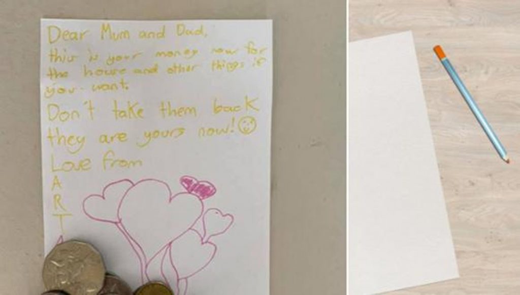 La hija menor escribió una carta y les dio el poco dinero que había ahorrado. Era en total 11 dólares australianos con 75 céntimos. “Queridos mamá y papá, este es su dinero ahora para la casa y otras cosas si quieren. No lo devuelvan, ¡ahora les pertenece!”, decía el tierno mensaje que les escribió la pequeña.