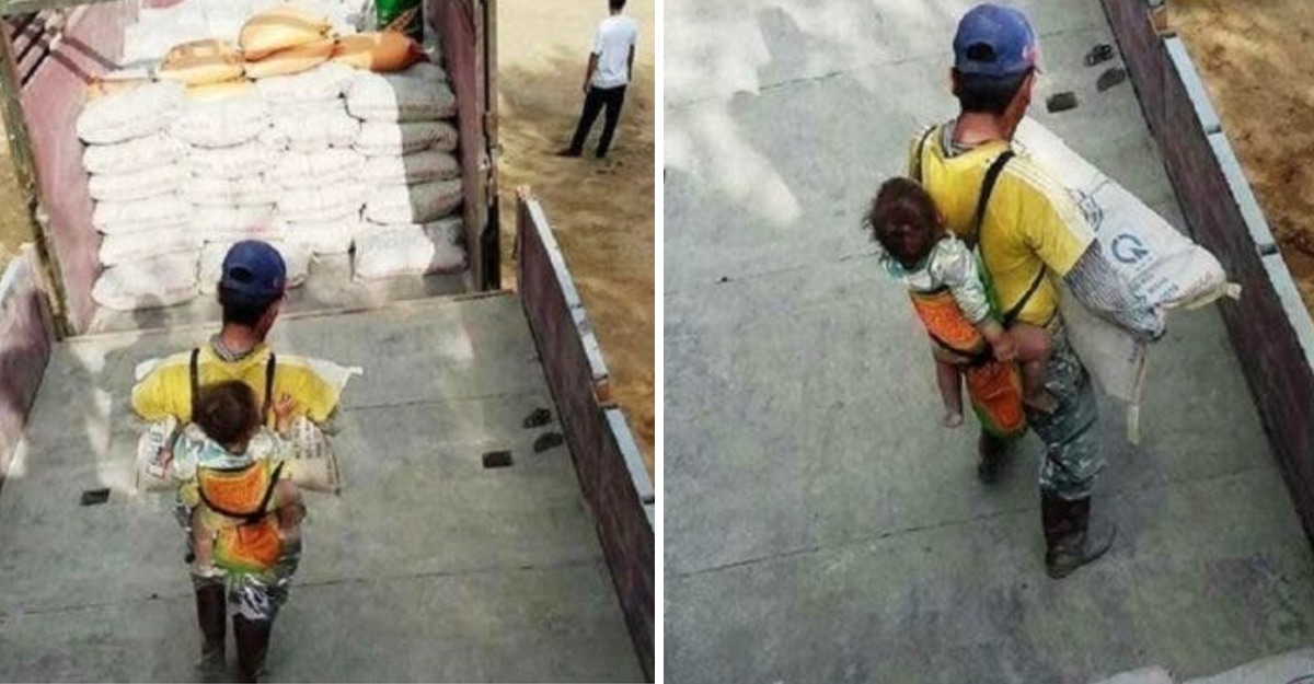 Un obrero viudo carga a su hijo en la espalda en la obra para no dejarlo solo