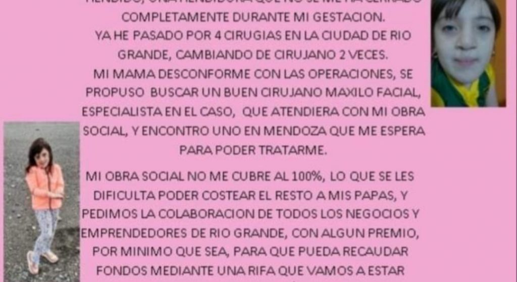 Ingrid es una niña de 7 años proveniente de la ciudad de Rio Grande quien nació con labio leporino y paladar hendido, por ello, actualmente, busca junto a sus padres la colaboración de la comunidad para recaudar fondos ya que debe realizarse una cirugía en la provincia de Mendoza y la obra social que poseen no le cubre el 100%.
