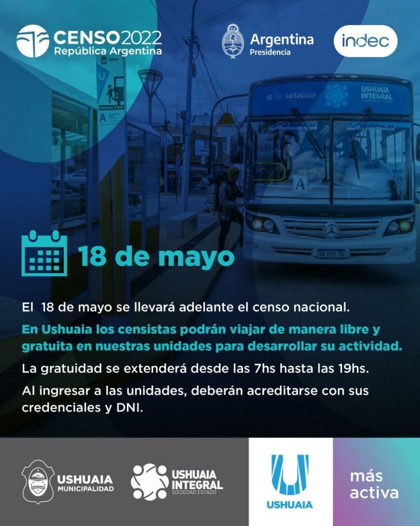 La Municipalidad de Ushuaia y la empresa Ushuaia Integral Sociedad del Estado (UISE) resolvieron adherir a la Resolución 283/2022 del Ministerio de Transporte de la Nación que dispone para mañana miércoles 18 de mayo, en el marco del censo nacional, la prestación gratuita “de los servicios de transporte público automotor urbano y suburbano y ferroviario de pasajeros de jurisdicción nacional, para las personas debidamente identificadas como censistas”.