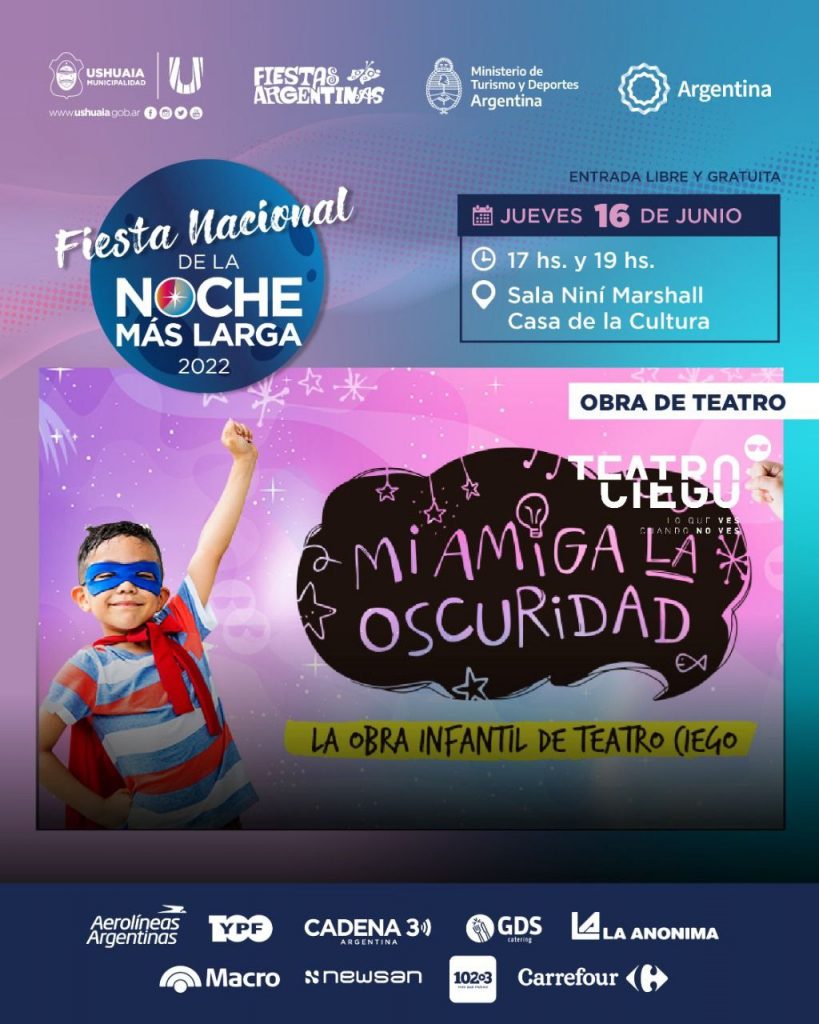 La propuesta infantil de Teatro Ciego “Mi Amiga la Oscuridad” se presentará por primera vez en Ushuaia, contando con dos funciones el día jueves 16 a las 17:00 y 19:00 en la Sala Niní Marshall de la Casa de la Cultura. La secretaria de Cultura y Educación, Belén Molina, explicó que “pensando en las y los más chicos, sumamos a la oferta cultura de la Fiesta Nacional de la Noche Más Larga una obra que nos permite ponernos en el lugar del otro y empatizar con el día a día de una persona ciega”.