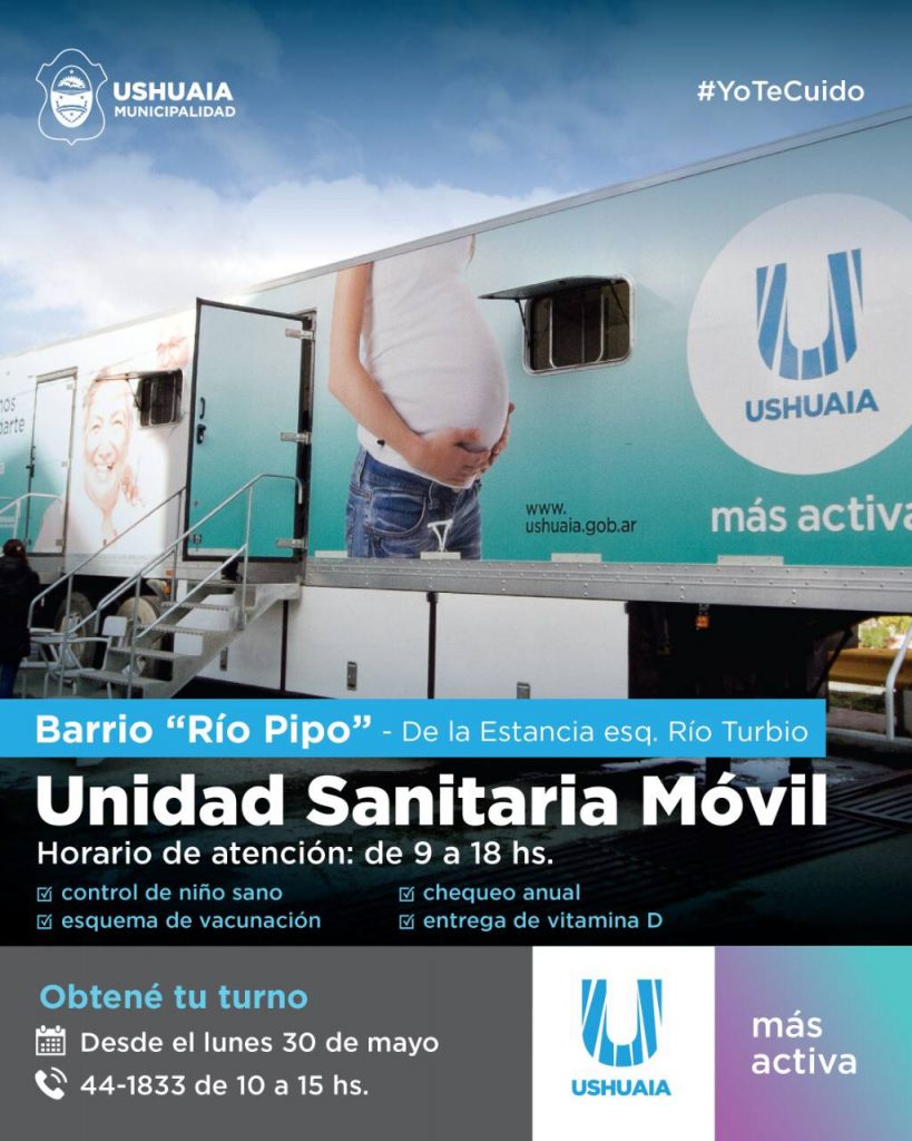 El equipo multidisciplinario de la Subsecretaría de Políticas Sanitarias del Municipio de Ushuaia informa a los vecinos y vecinas que desde el próximo lunes 30 de mayo, la Unidad Sanitaria Móvil y el Quirófano Móvil de la Dirección de Zoonosis estarán ubicadas entre las calles De la Estancia y Río Turbio del Barrio Río Pipo.