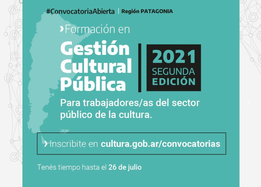 El Ministerio de Cultura de la Nación invita a una nueva convocatoria para Formación en Gestión Cultural Pública, dirigida a las trabajadoras y trabajadores públicos de la cultura. De los cuales se seleccionarán cincuenta participantes por cada una de las seis regiones del país: NOA, NEA, Cuyo, Centro, Buenos Aires y Patagonia.