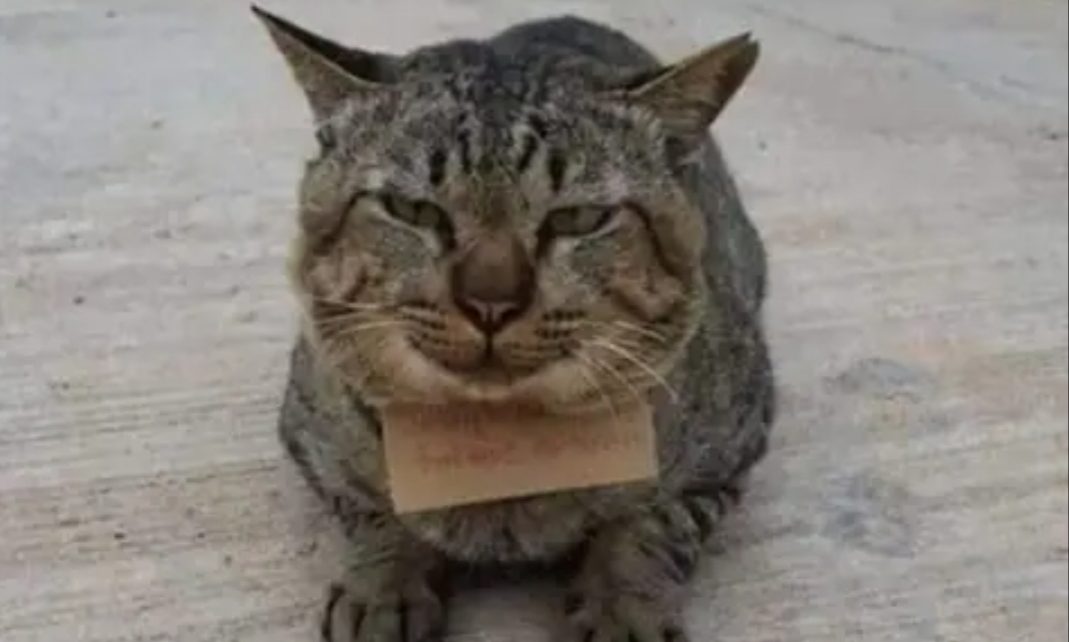 Cuando el gato regresó a su hogar, tras varios días de estar ausente, su dueño vio que alrededor del cuello llevaba un cartel.