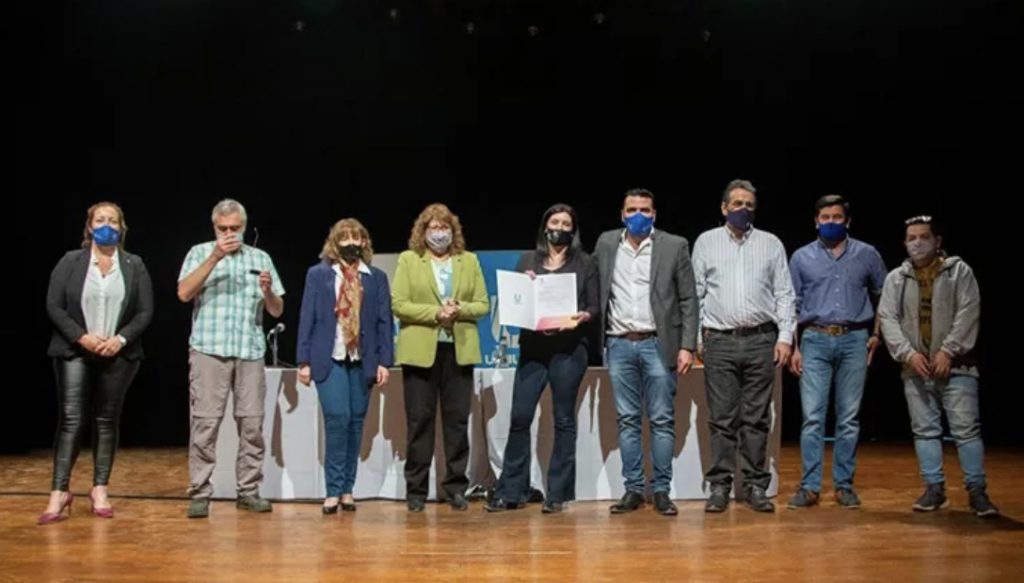 El intendente de Ushuaia Walter Vuoto junto la diputada nacional Carolina Yutrovic, y a la Secretaria de Habitat y Ordenamiento Territorial, Lorena Henriques Sanches, entregó el decreto de adjudicación de un predio en Andorra al Sindicato de Jerárquicos de la Municipalidad, para la construcción de su sede social. Tras finalizar el acto, Vuoto anunció que se trabajara con el gremio de Jerárquicos para dar respuesta a la demanda habitacional de los asociados junto al Ministerio de Desarrollo Territorial y Hábitat de la Nación.